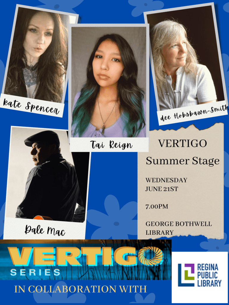 Join us at the George Bothwell library branch for Vertigo’s Summer Stage either in person or online! Our guests are Kate Spencer, dee Hobsbawn-Smith, and featuring Tai Reign with music from Dale Mac. Register online at the library: https://www.reginalibrary.ca/attend/programs/8468808 or watch online here: https://www.reginalibrary.ca/attend/programs/8469098